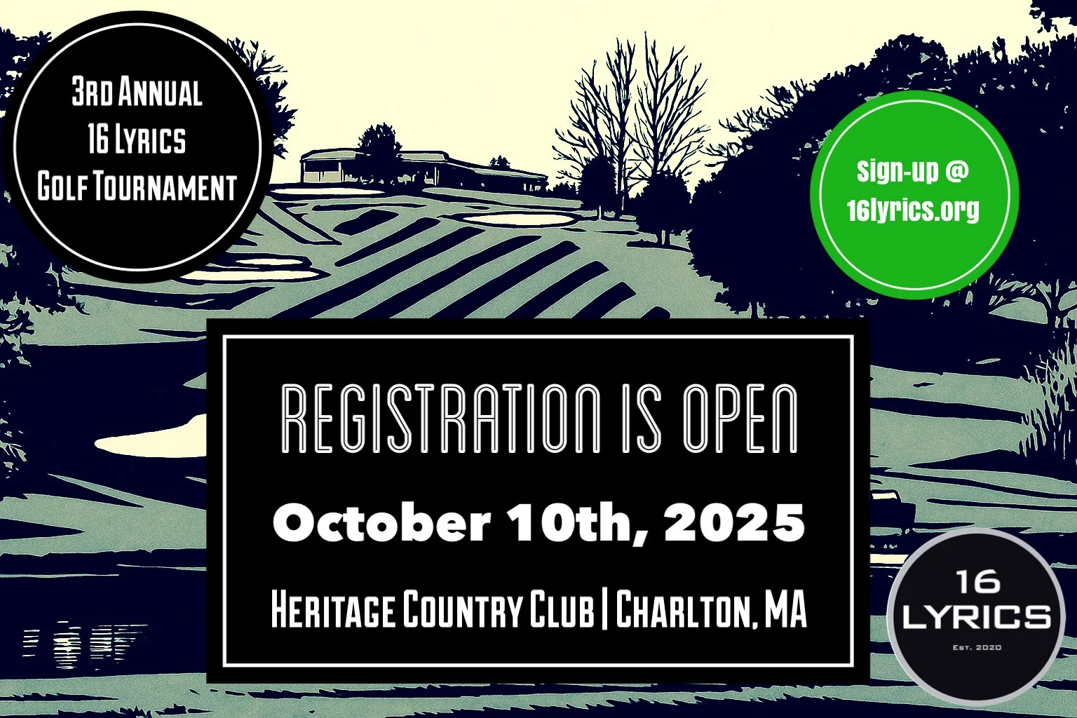 Join us for the 3rd Annual 16 Lyrics Golf Tournament on Friday, October 10, 2025 at Heritage Country Club, Charlton, MA. Enjoy a great day of golf while supporting our mission! Sponsorships available—a perfect way to show your support and gain visibility.